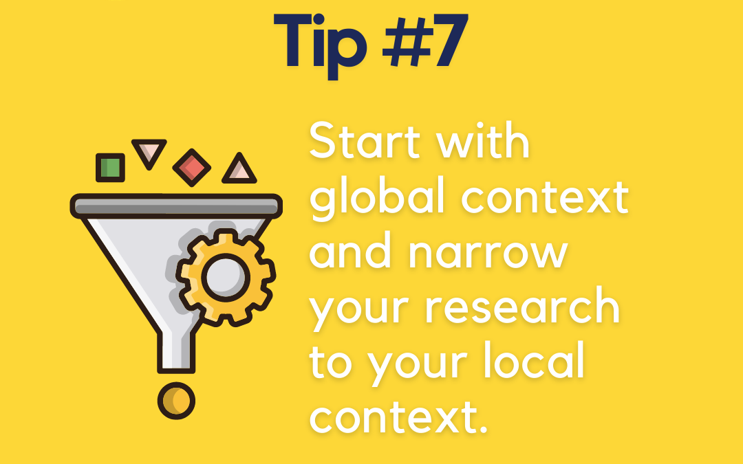 7. Go from global to local: Start with the satellite view. Read what’s being said internationally. Then land the spaceship and figure out how it fits in your backyard. Studies on climate education in Finland might be inspiring, but your fieldwork in Pune or Pondicherry has its own culture, climate, and coconut trees. The local context is what makes your research real—and useful.